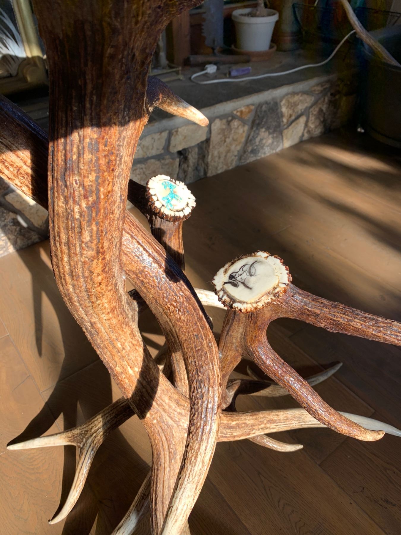 DONATION: You don’t want to miss the opportunity to bid on this one-of-a-kind high top bar table. It is 36" high (standard bar top height). with turquoise inlay in the top and one antler. WSF logo in another antler. The base is put together with antlers from Larry Jacobs and ODFW in a fashion to show off the beauty of antler art. The wood is from an OR-FNAWS Juniper cut project.