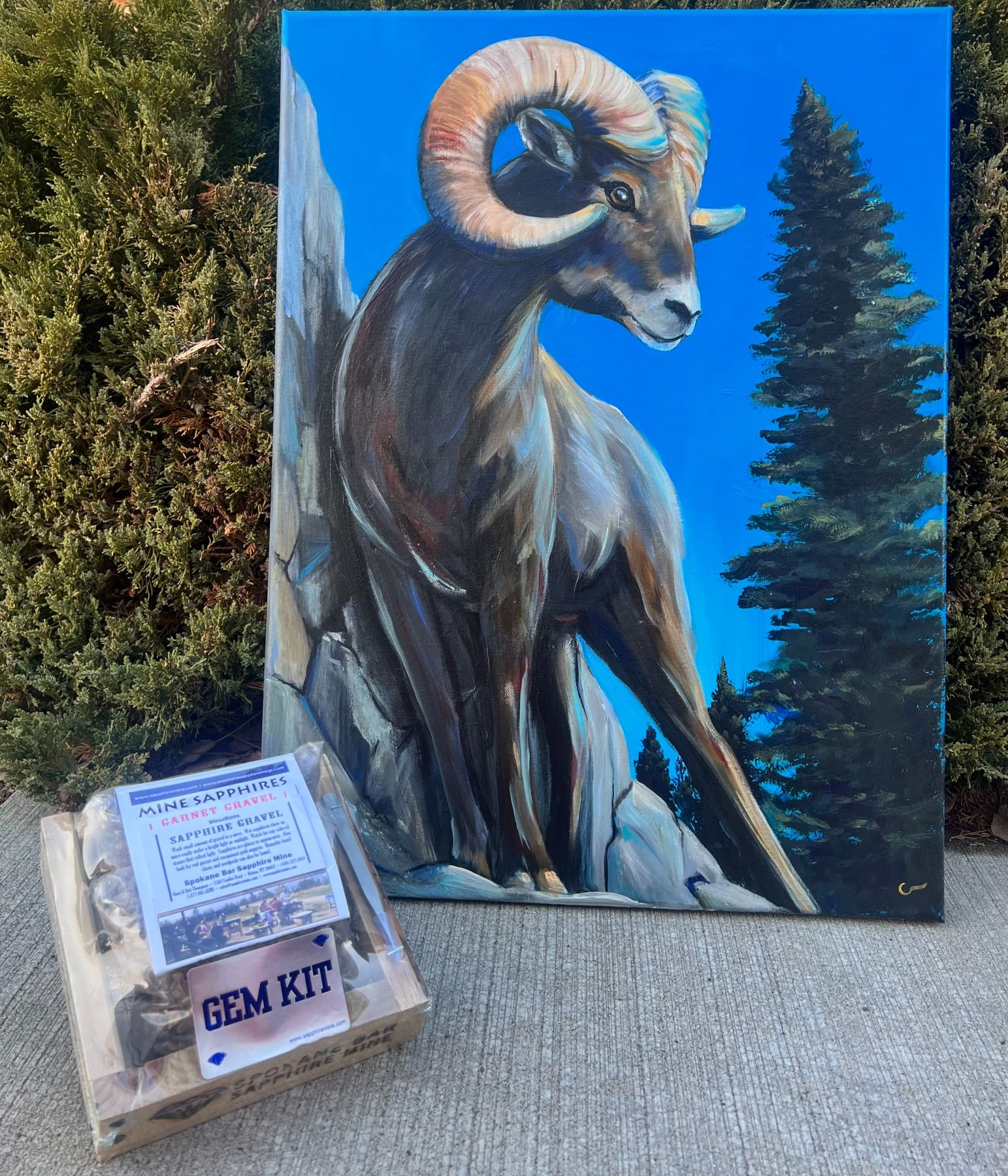 Acrylic Bighorn Ram Painting and Spokane Bar Sapphire Mine Gem Kit