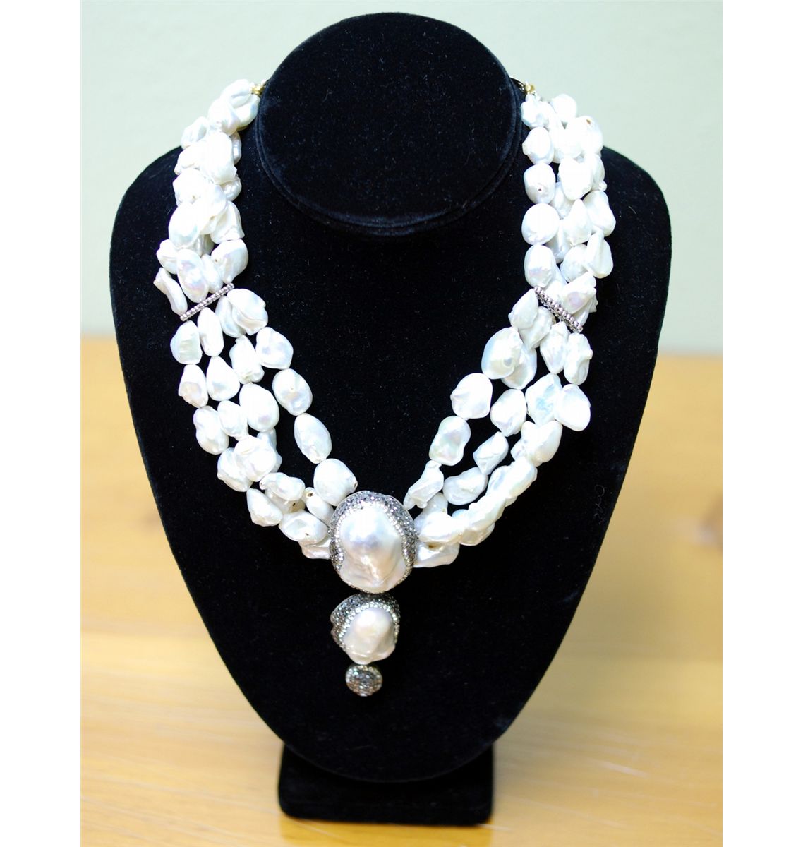 Donation: This is a beautiful (4) strand woven Baroque fresh water pearl necklace with triple bezel pearls, and two tone Swarovski crystals accompanied with a beautiful set of earrings.