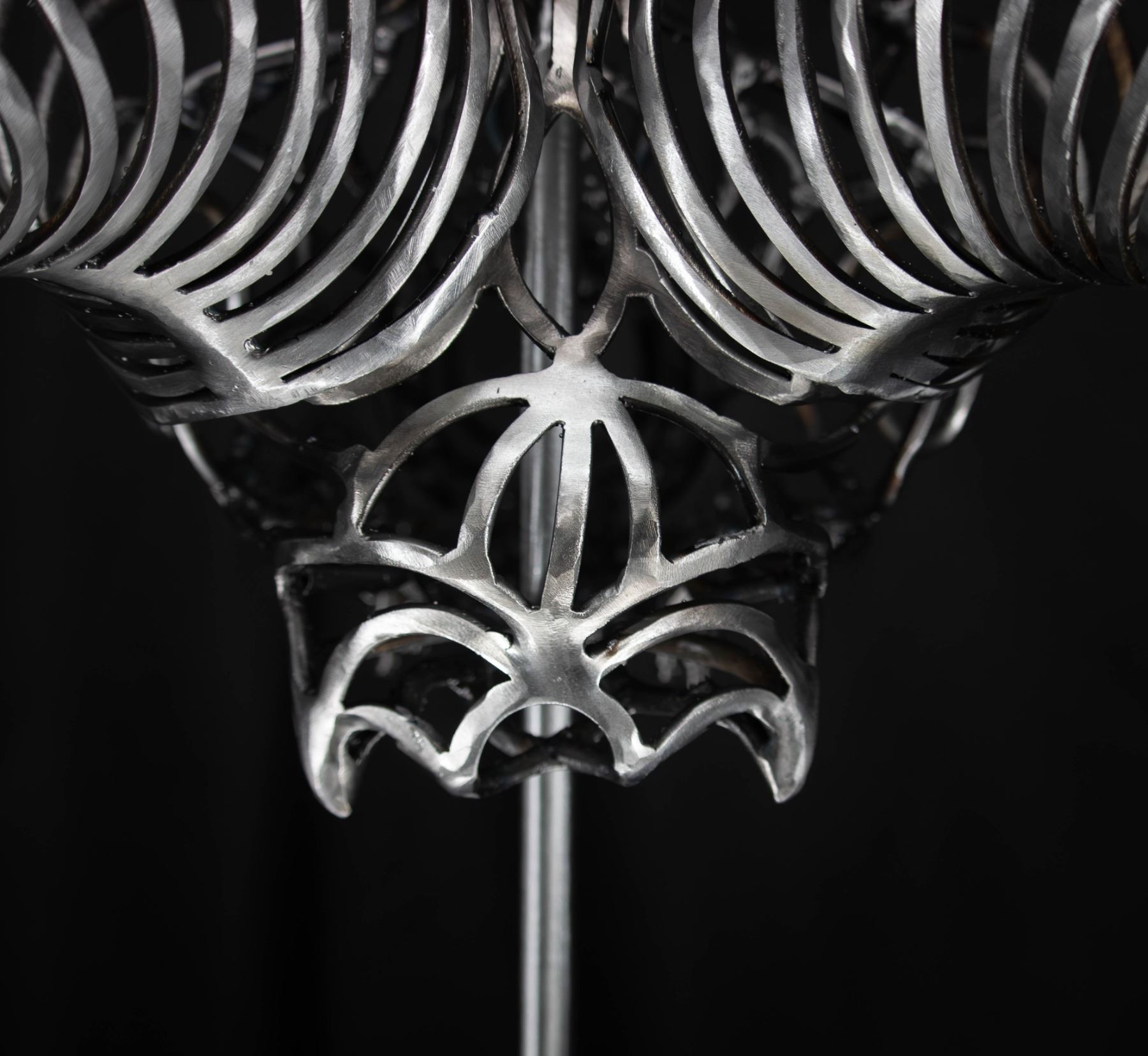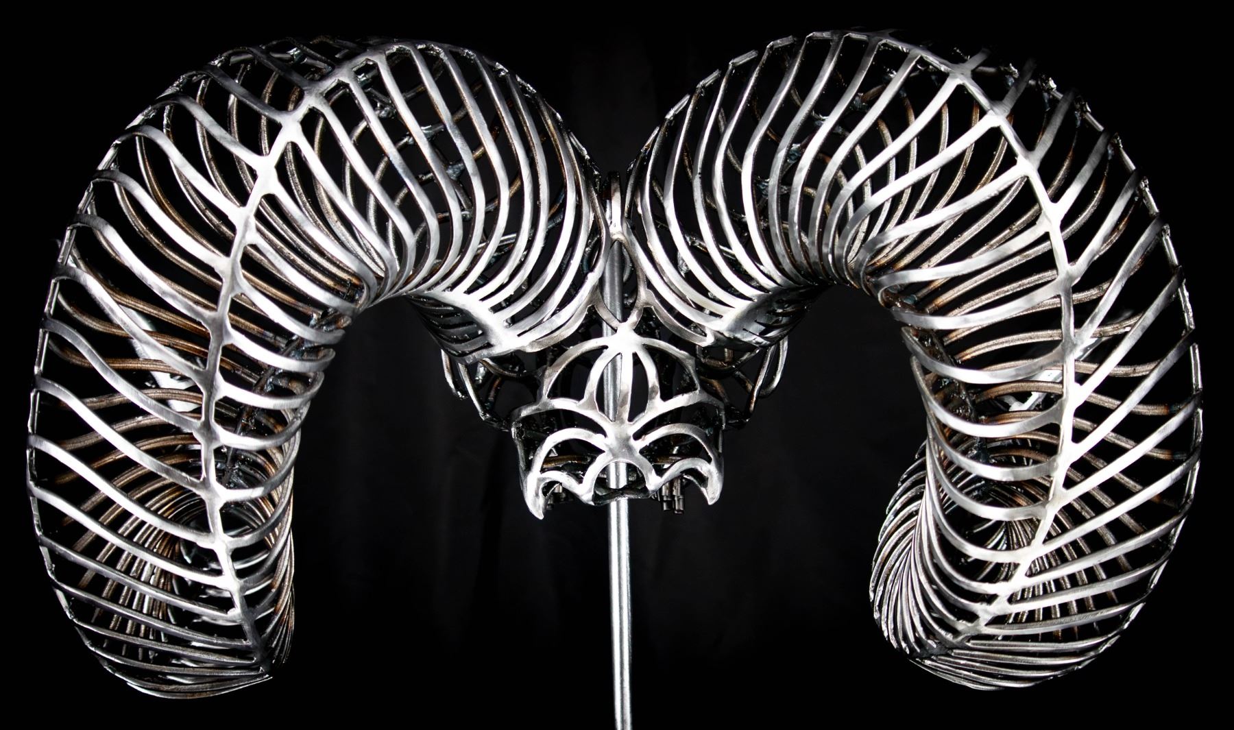 In my sculptures, I meticulously sculpt these intricately adorned ram skulls, paying close attention to every detail. By strategically placing the bent metal pieces, I achieve a harmonious fusion of abstract aesthetics and lifelike representation, ensuring an authentic portrayal of the bighorn sheep.
