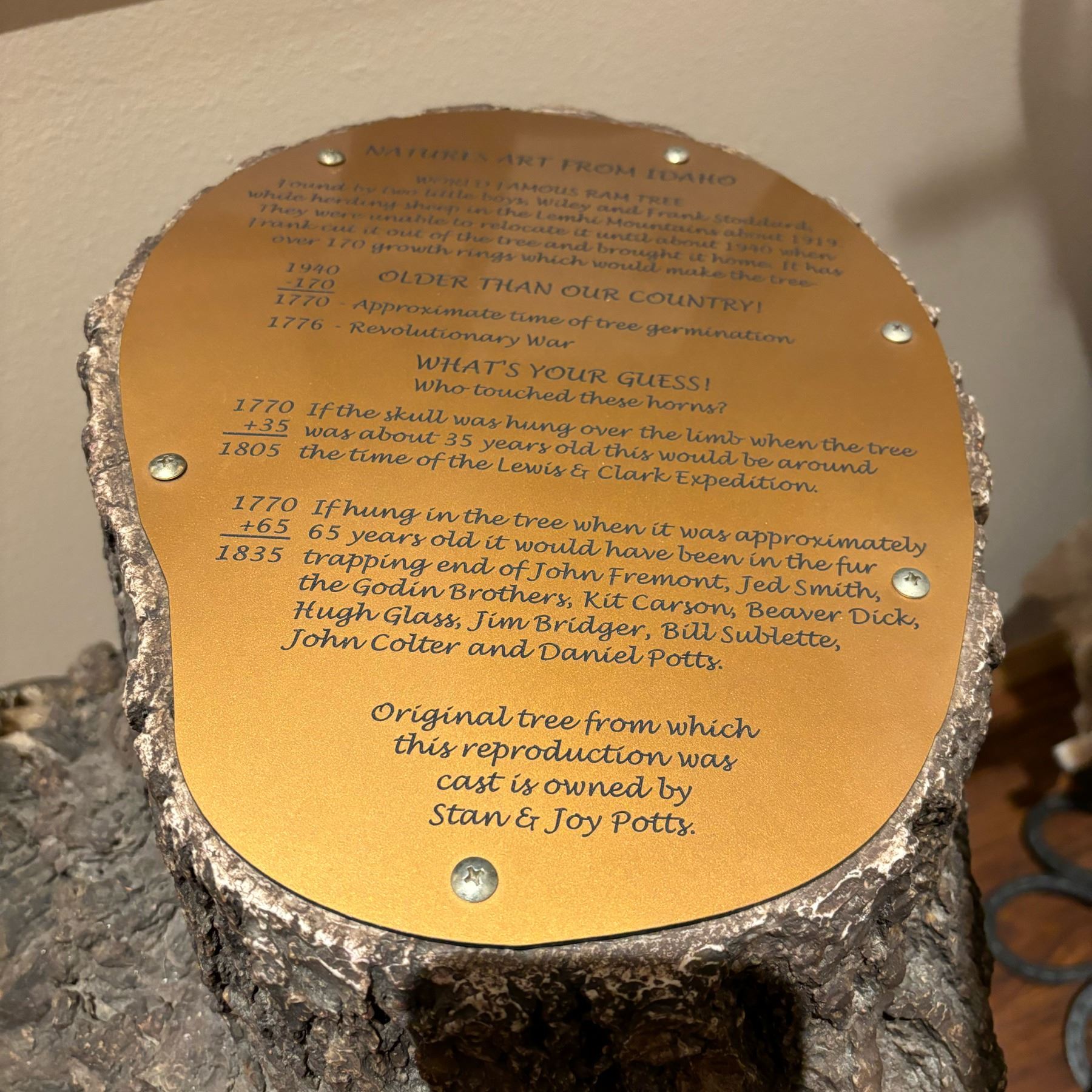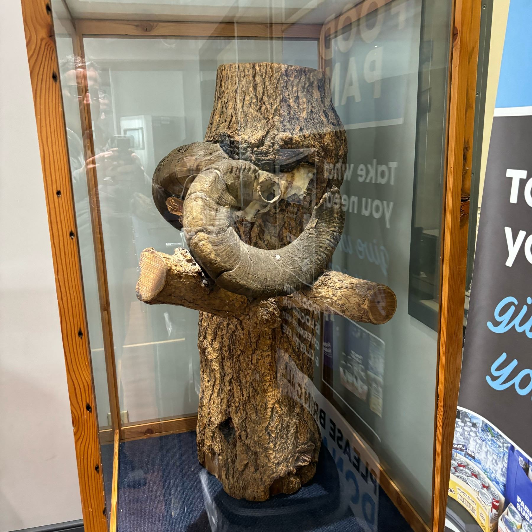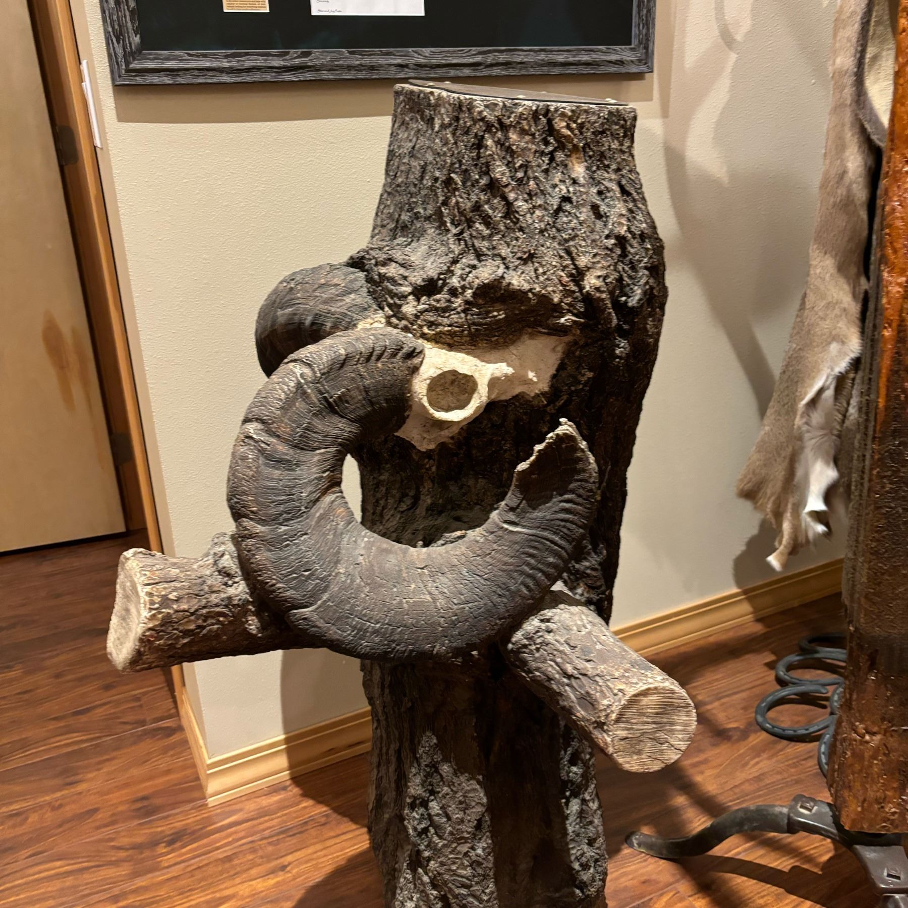 This bighorn sheep skull embedded in a tree was spotted by Frank Stoddard and his brother in 1920s while they were herding sheep.