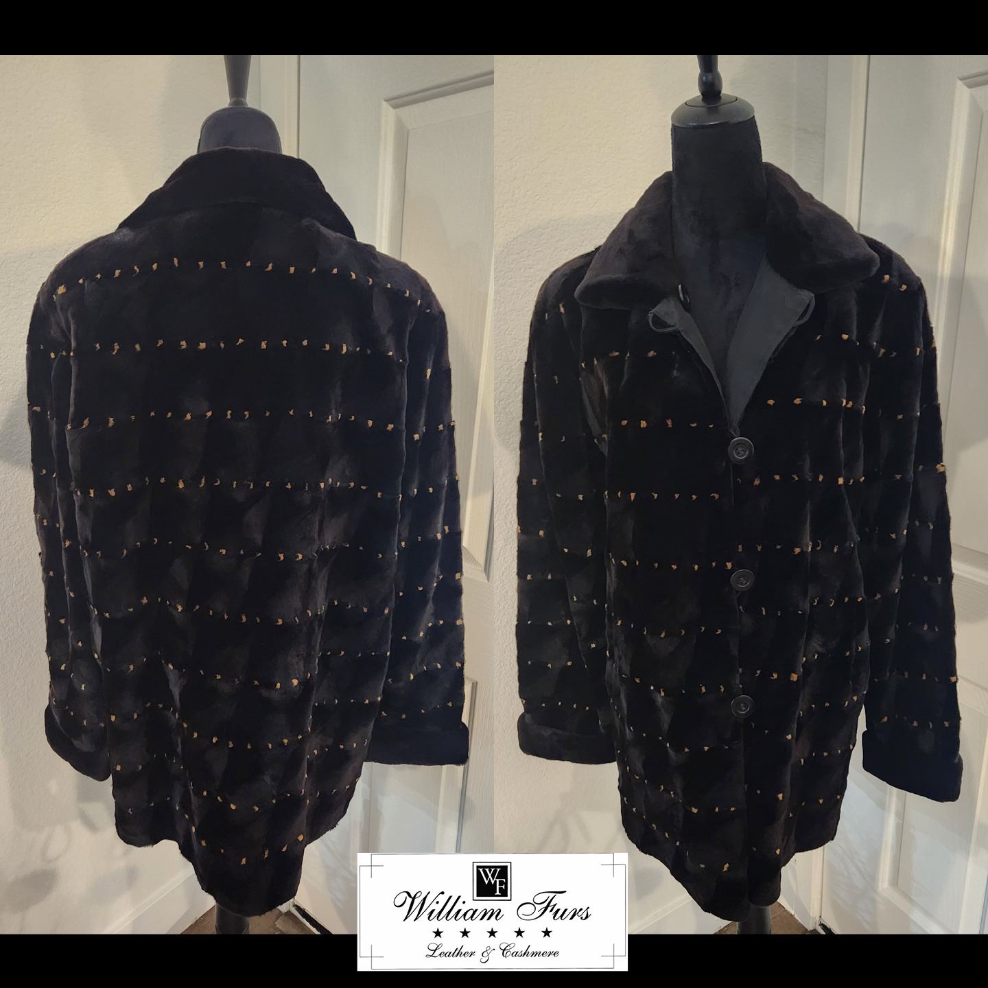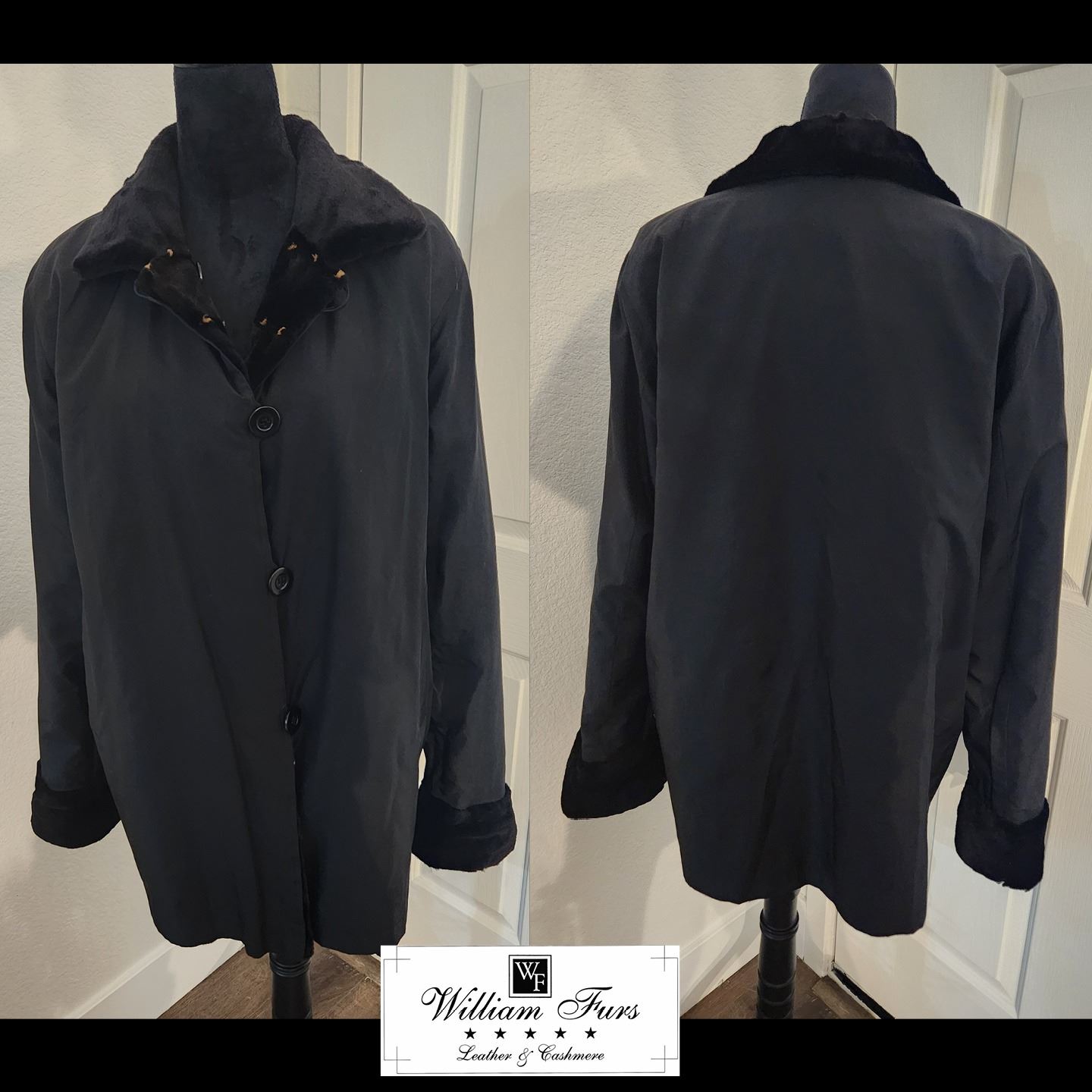 BLACK AND GOLD SPOTTED SHEARED MINK STROLLER REVERSIBLE TO TAFFETA RAINCOAT PERFECT FOR TRAVELING