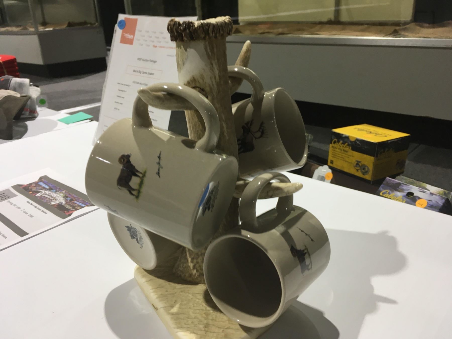 Description: Elk/Moose Antler Coffee Mug Holder with 4 Wild Game Mugs