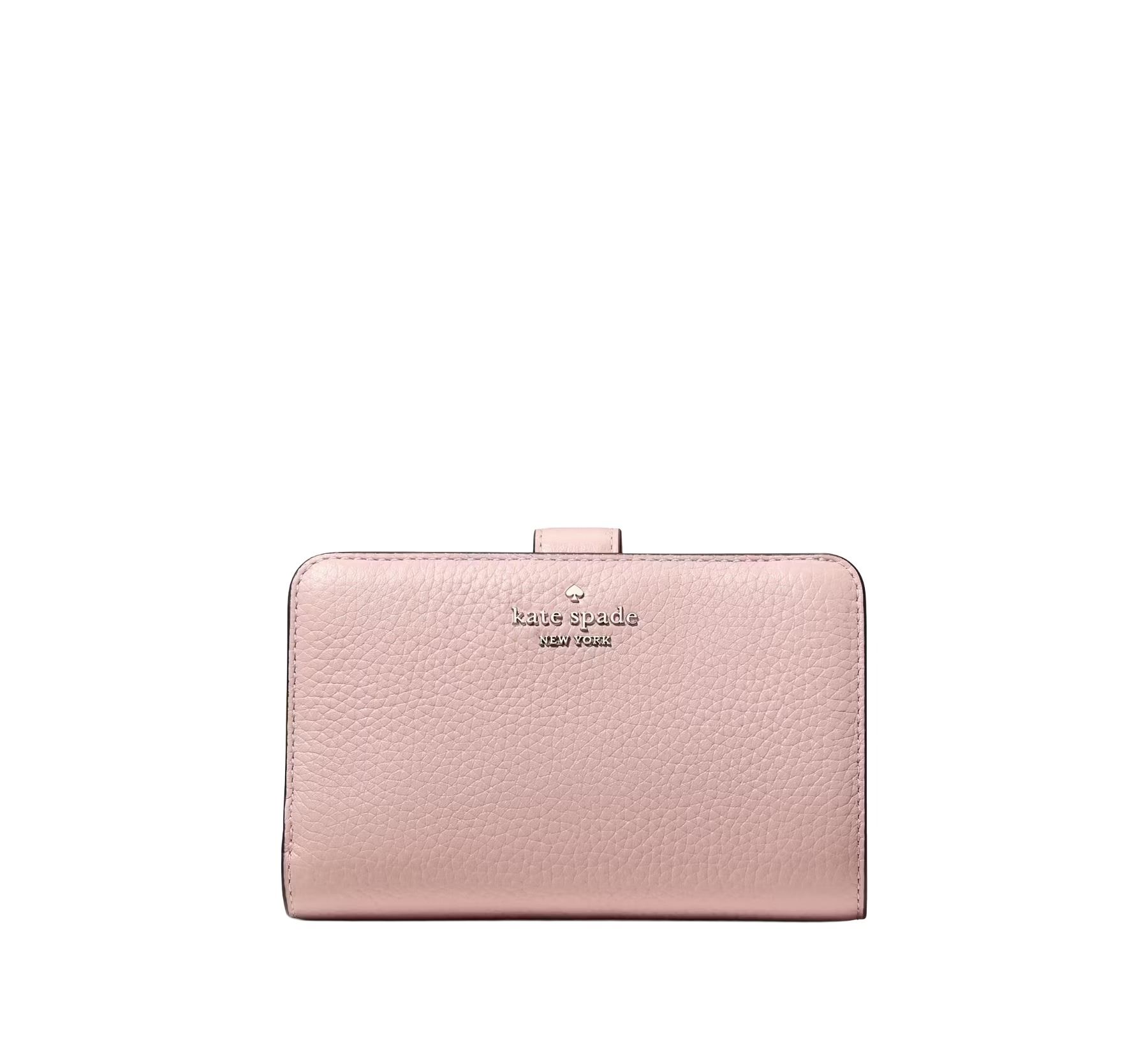 The Kate Spade Lena Medium Bifold Wallet is a compact, pebbled leather wallet known for its organization, featuring a snap closure, 9 card slots, ID window, bill slot, 2 slip pockets, and a convenient exterior L-zip coin pocket, all detailed with a spade logo and fabric lining for storing essentials without bulk.