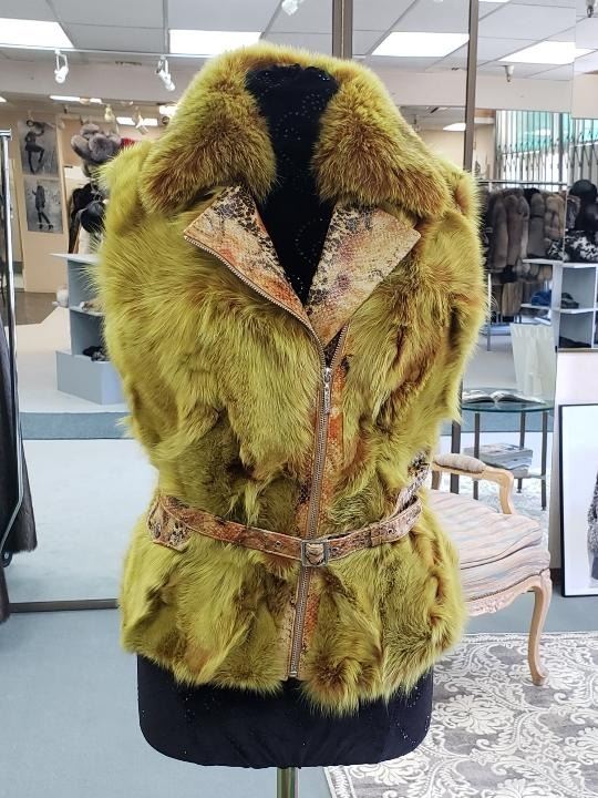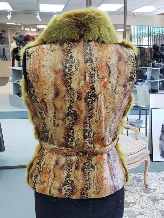 Description: Multi-colored snake print vest with green fox trim. Non exchangeable