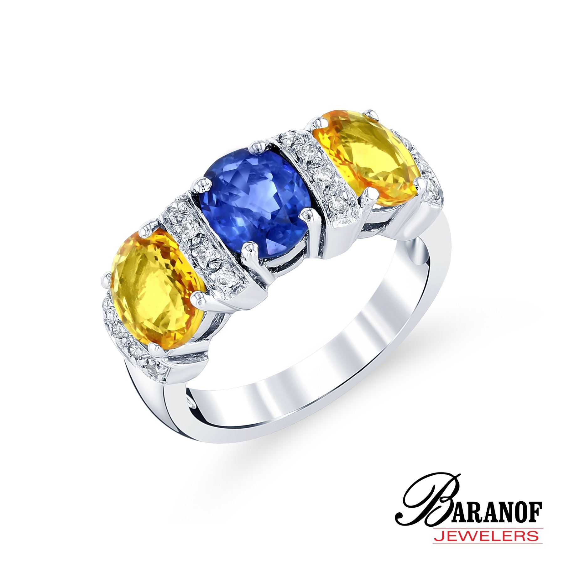 DONATION: Natural yellow and blue sapphire ring sent with diamonds. Set in 18 karat white gold, 2.50 carats of natural yellow sapphires, 1.25 carat Ceylon blue sapphire, 0.25 total carat weight of brilliant round cut diamonds, G color, and Vs2 clarity.