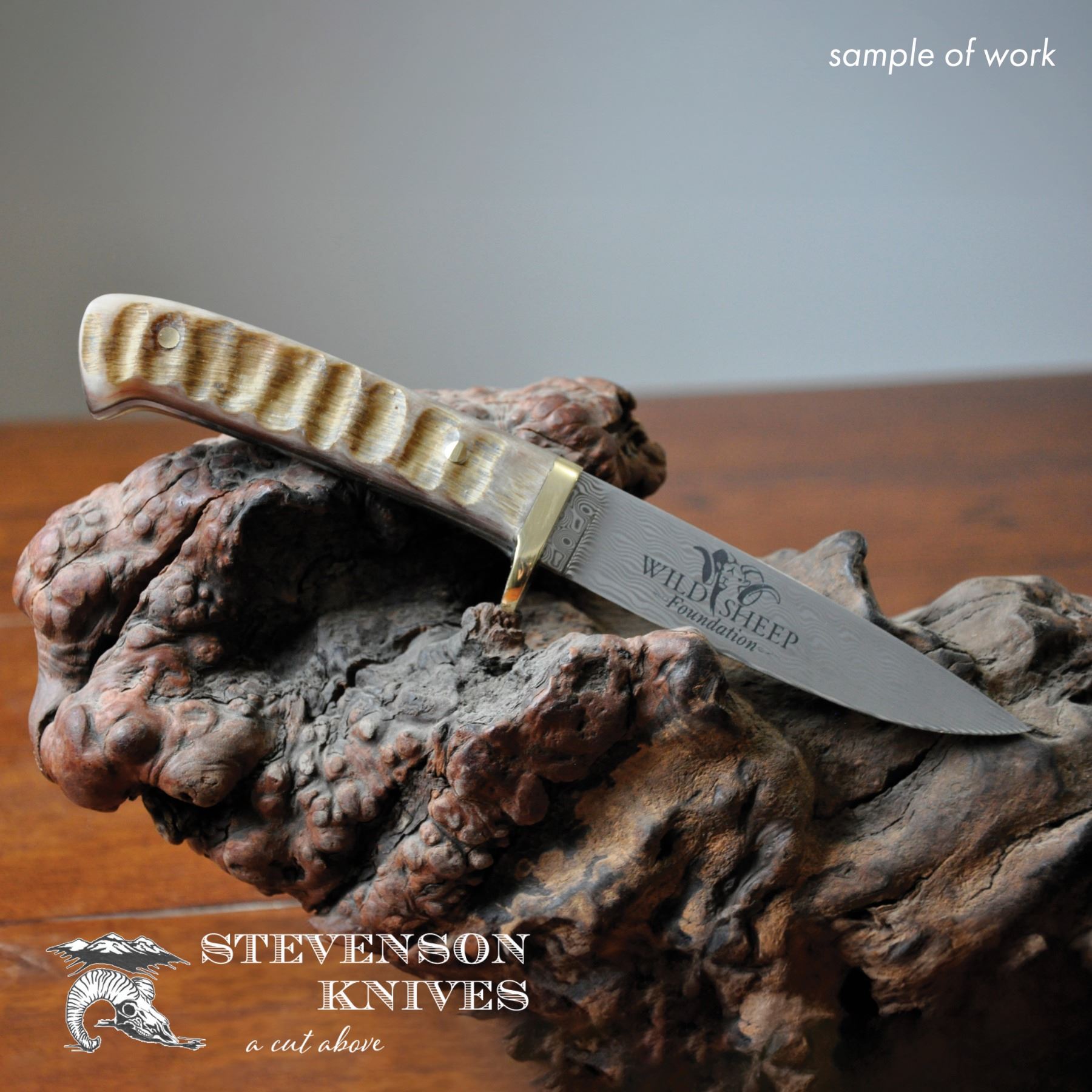 Description: (100% Fully Donated) This is a custom RWL 34 ""Gentlemen’s'"" blade carry knife with bolsters and sheep horn handle. Comes with a custom sheath with WSL logo and logo is also on the blade. Don Stevenson is donating this knife especially for the annual WSF Thinhorn Summit meeting. Don's been building custom knives for nearly 25 years and donating to conservation programs for over 22 years.. Don't miss the opportunity to own a Don Stevenson knife!