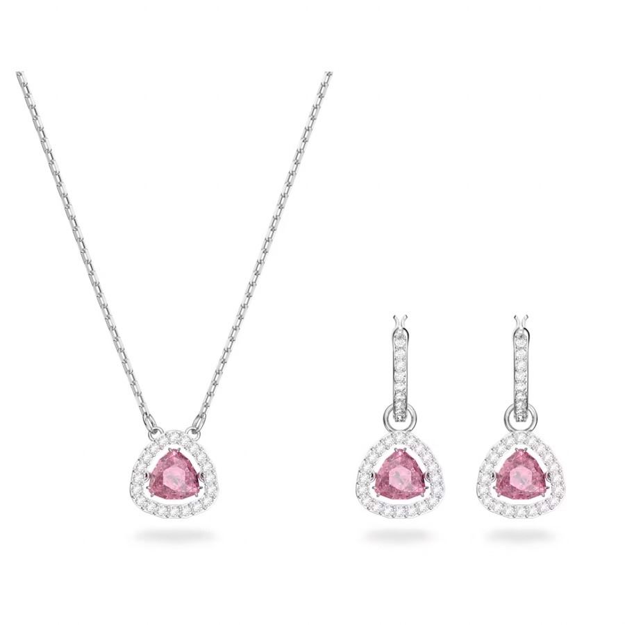 Description: Designed to wear and love forever, this timeless pendant and earrings set will make a beautiful gift for someone special. Featuring elegant pink stones, framed with smaller brilliant-cut pavé crystals, each piece has a rhodium plated setting for a modern finish. This jewelry set is part of the Millenia Family, designed for Collection III. Article no.: 5619503, Necklace length: 14 7/8 inches, Earring length: 7/8 inches, Material: Crystals, Rhodium plated, Zirconia, Color: Pink, Clasp type: Lobster