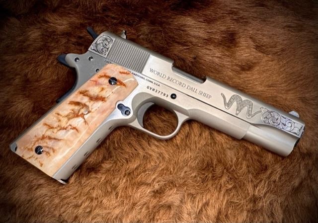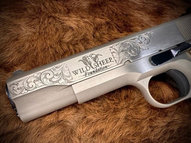 DONATION: Custom designed Colt 1911 four-gun World Record Ram Series. Each gun will feature hand-chased engraving, custom finish work and ram horn grips of the four species of wild sheep. Each gun will have a custom wood presentation case and include a unique challenge coin for each species.