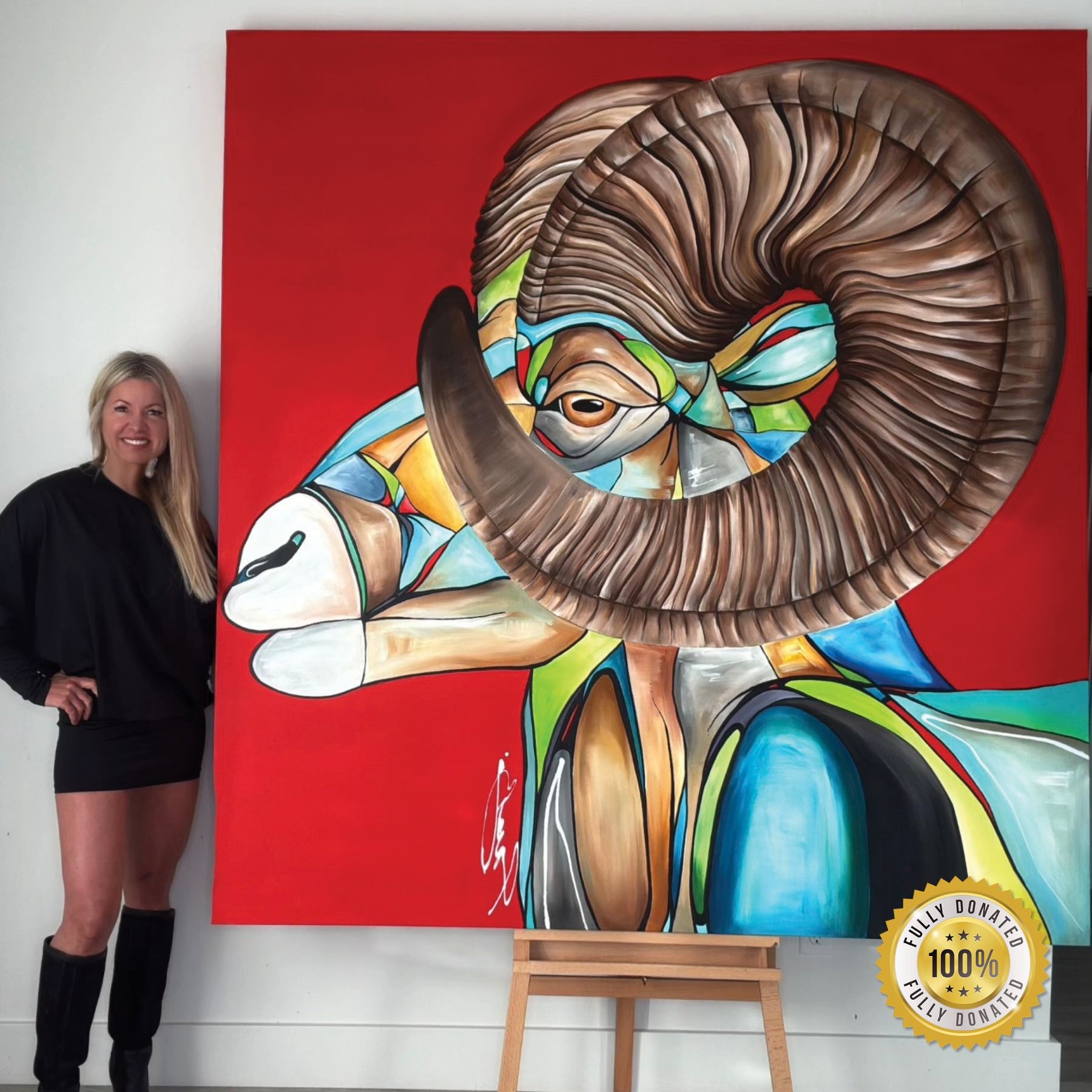 “Worth the Weight” is a Tara Banks original bighorn ram acrylic painting 6’x6’.