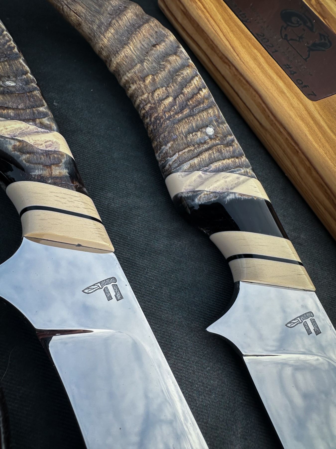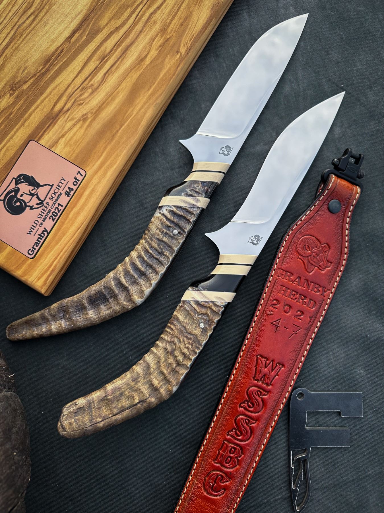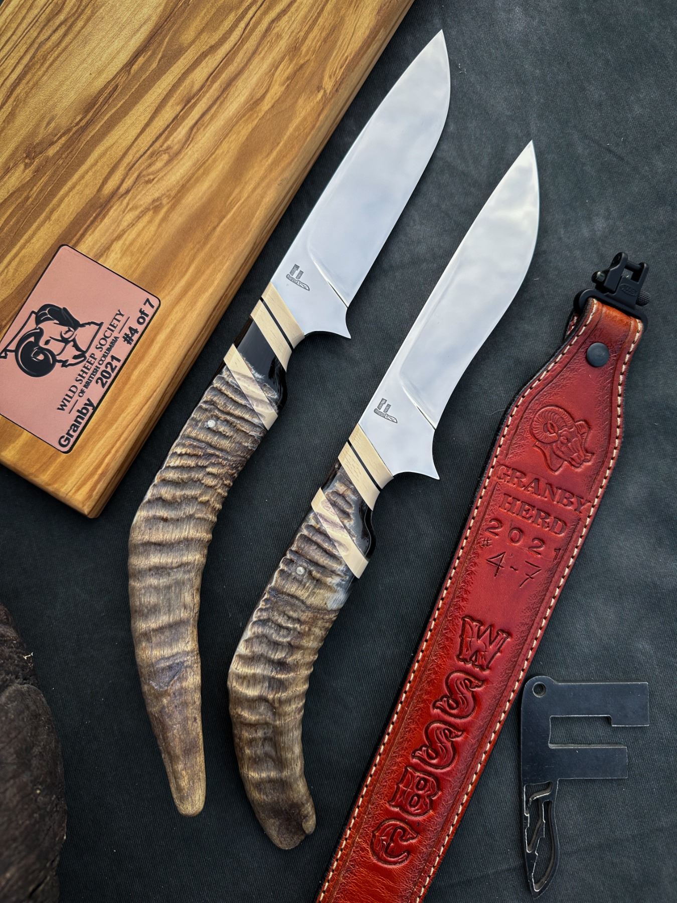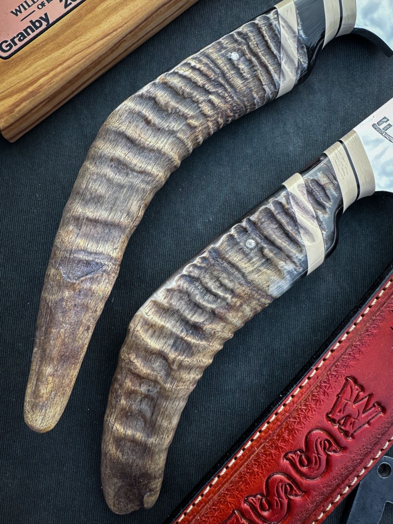 DONATION The fourth installment of the WSSBC Bluetongue knife series. These heritage blade sets are made with recovered horns from the Granby Bighorn sheep that passed in the devastating 2021 B.C Bluetongue die off.