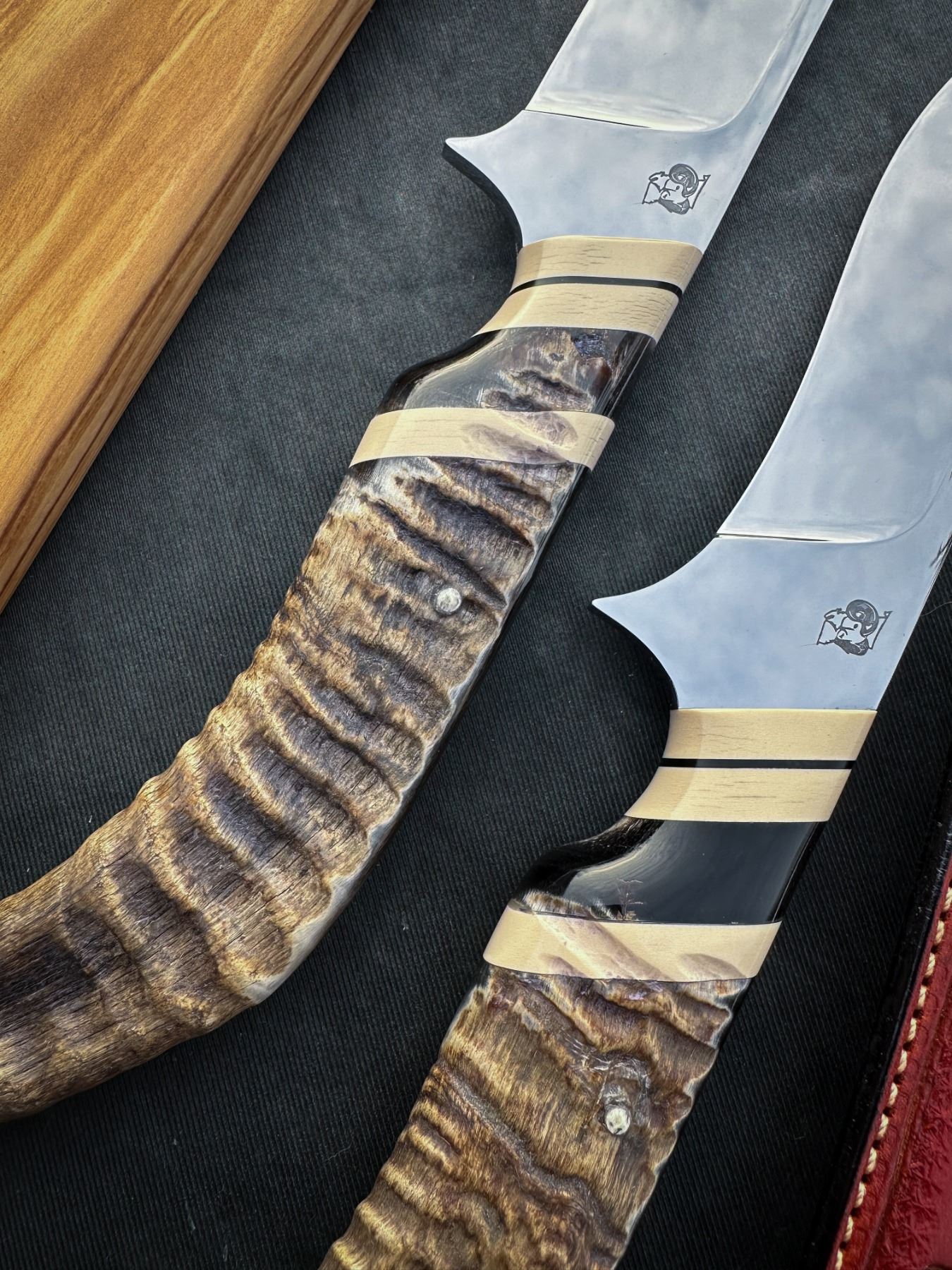 • Both blades display raw horn handles highlighting matching lamb tips from each side of the sheep’s head.