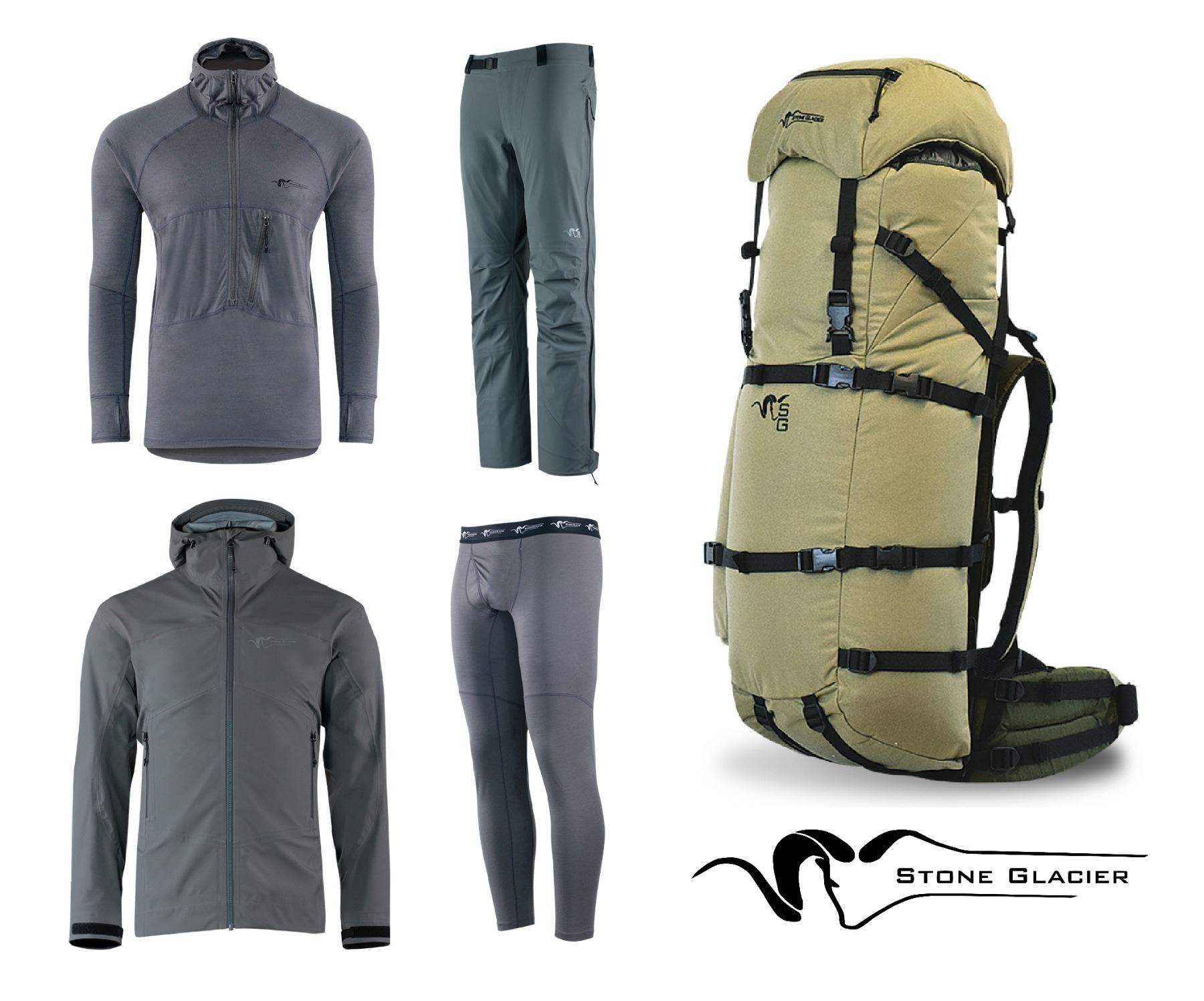 STONE GLACIER GEAR PACKAGE (Pack: 40/56 w/Lid, De Havilland Lite Pants/Jacket, Long Sleeve Merino Top/Bottoms)