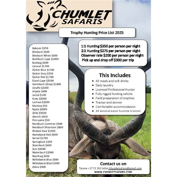 Hunt South Africa with Chumlet Safaris for a Nyala and an Impala to be shared by the hunters. Donor... Show more..